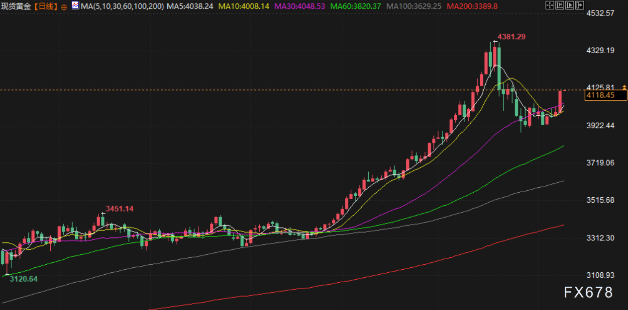 —周二(北京时间11月11日),现货黄金交投于4120美元/盎司附近,金价周一攀上近3%,创下两周多以来的最高收盘水