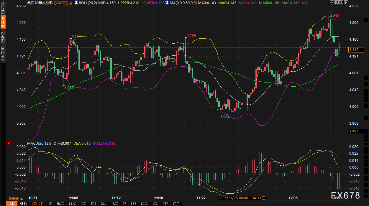 从240分钟图观察,10年期收益率正下探布林带下轨(4.129%)支撑。MACD指标于零轴上方呈现微弱金叉但动能匮乏,显示反弹无力。知名机构策略观点倾向于在4.19%附近看空收益率,目标指向4.08%。